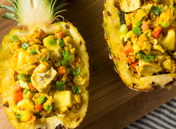 A balance of sweet, fruity and mildly spicy flavours, our Thai pineapple fried rice recipe is most impressive when served from a freshly prepared hollowed-out pineapple bowl. If you have them to hand, you can also throw in some cashew nuts for an additional crunchy texture!